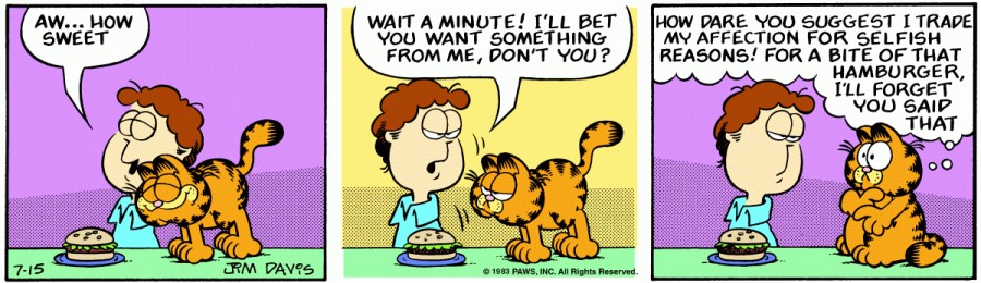 Garfield: How dare you suggest I trade my affection for selfish reasons! For a bit of that hamburger, I'll forget you said that.
