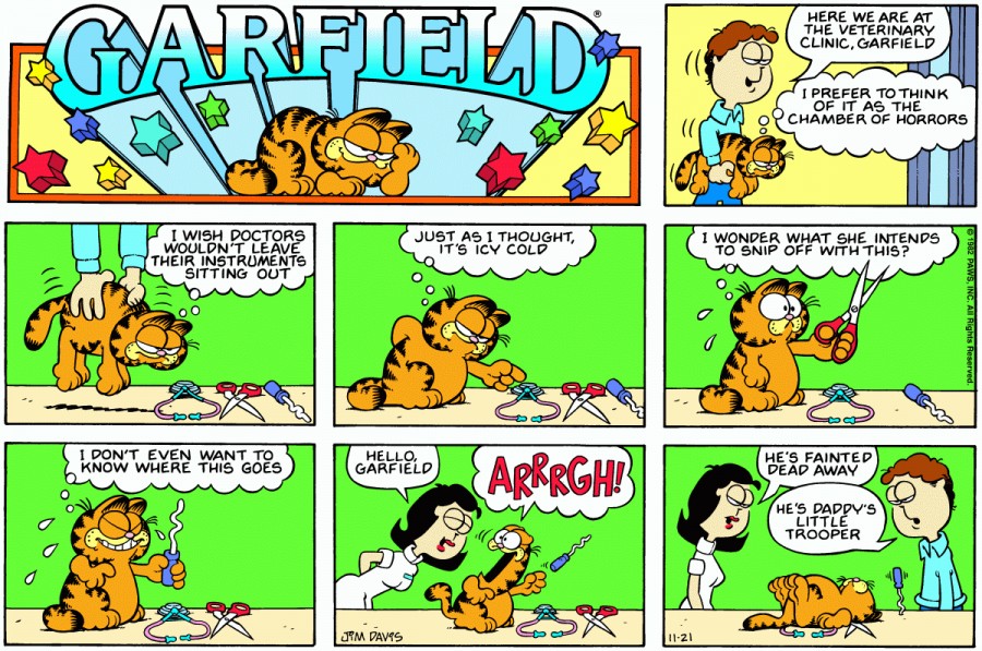 Garfield: I prefer to think of it as the chamber of horrors. I wish doctors wouldn't leave their instruments sitting out. Just as I thought, it's icy cold. I wonder what she intends to snip off with this? I don't even want to know where this goes.
