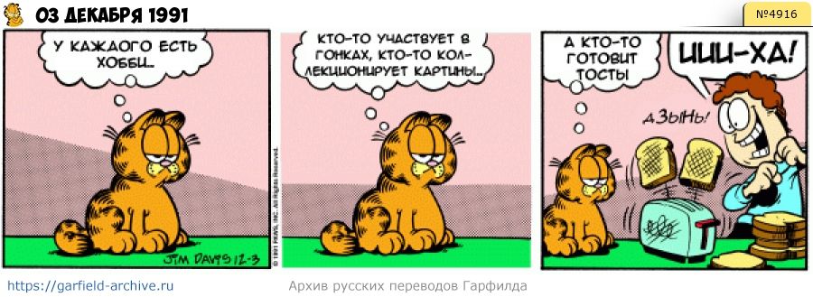 Garfield: Everybody has a hobby. Some race cars, some collect art... And others. Make toast.