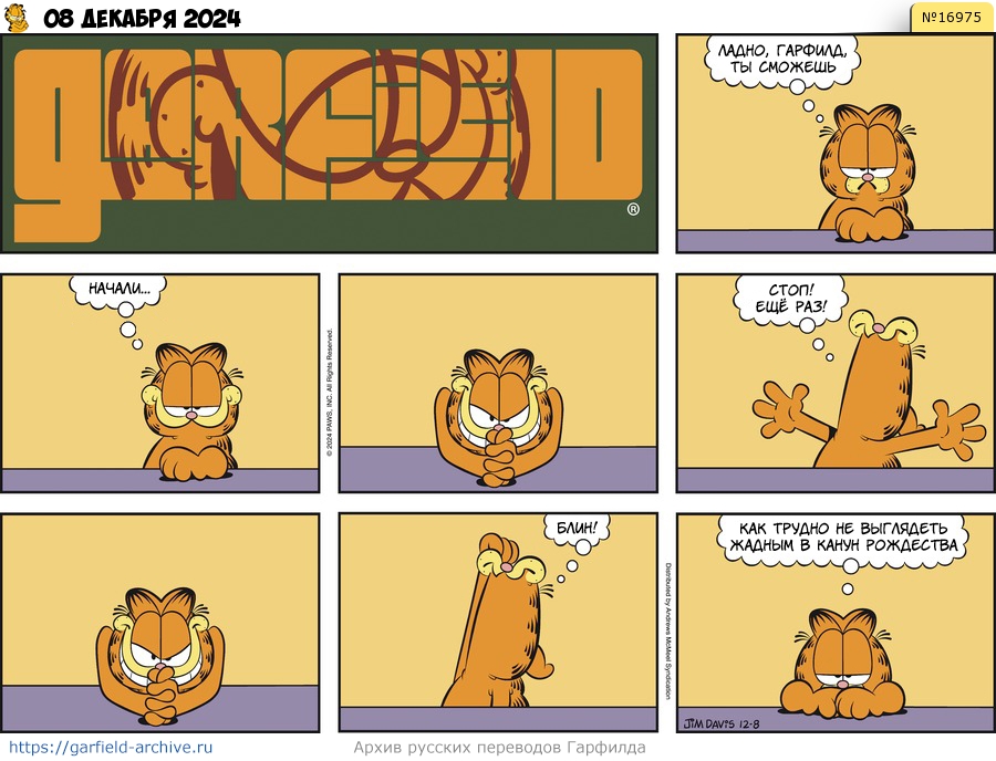 Гарфилд: Ладно, Гарфилд, ты сможешь... Начали... Стоп! Ещё раз! Блин! Как трудно не выглядеть жадным в канун Рождества