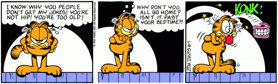 Garfield: I know why you people don't get my jokes! You're not hip! You're too old! Why don't you all go home? Isn't it past your bedtime?!