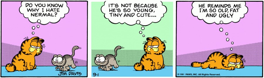 Garfield: Do you know why I hate Nermal? It's not because he's so young, tiny and cute... He reminds me I'm so old, fat and ugly.