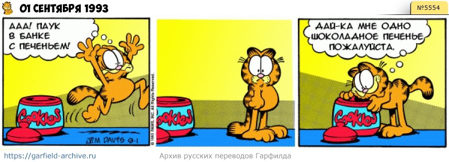 Garfield: EEK! THERE'S A SPIDER IN THE COOKIE JAR! Would you hand me a chocolate chip cookie, please?