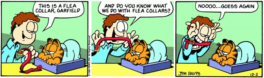 Jon: This is a flea collar, Garfield. And do you know what we do with flea collars? Noooo...guess again.