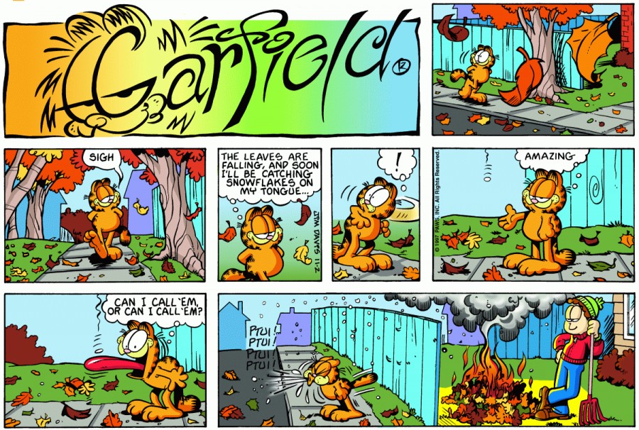 Garfield: Sigh. The leaves are falling, and soon I'll be catching snowflakes on my tongue... ! Amazing. Can I call 'em, or can I call 'em?