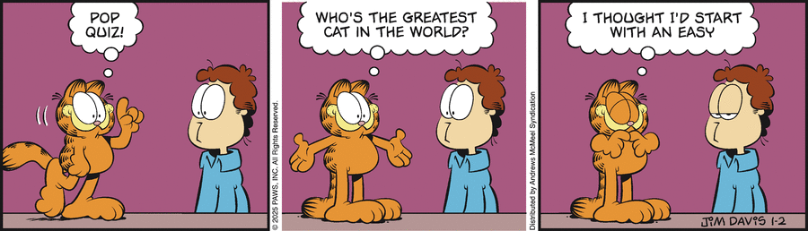 Garfield: Pop quiz! Who's the greatest cat in the world? I thought I'd start with an easy