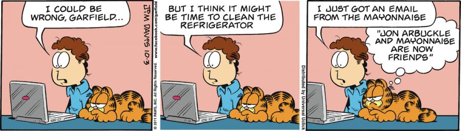 Jon: I could be wrong, Garfield... But I think it might be time to clean the refrigerator. I just got an email from the mayonnaise.