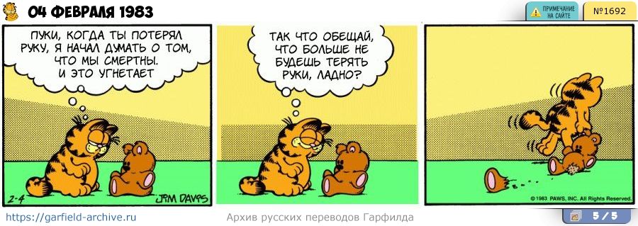 Очень интересная особенность - для нас странно говорить о руках и ногах у плюшевого медвежонка. И мы скорее скажем, что у него лапы. Передние, задние... Шутка строится на том, что Пуки не нарушает обещания, которое требует от него Гарфилд, и теряет не переднюю лапу («arm»), а заднюю. Если написать «больше не теряй лапы», будет не так смешно, потому что неправильно. А уточнять - верхние лапы или нижние - значит, уже настраивать читателя на поиск подвоха, тоже не очень смешно. Так что пусть будет «рука».