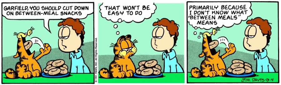Garfield: That won't be easy to do. Primarily because I don't know what «between meals» means.