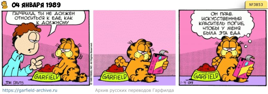 Garfield: He's right. An artificial color died to provide me with this meal.