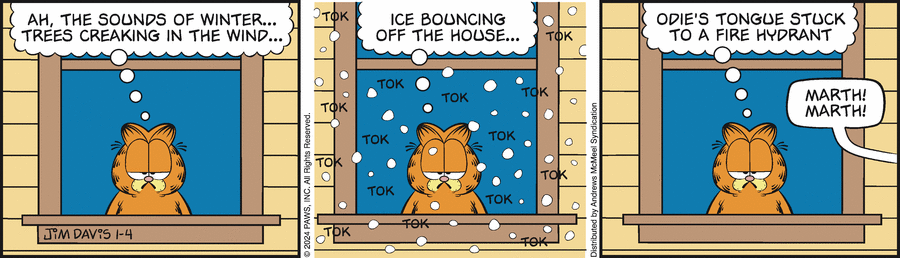 Garfield: Ah, the sounds of winter... Trees creaking in the wind... Ice bouncing off the house... Odie's tongue stuck to a fire hydrant
