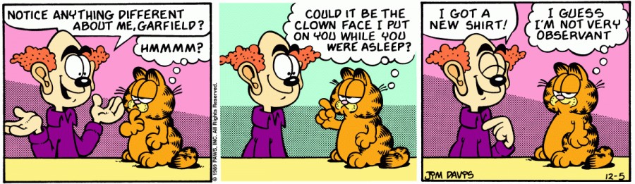 Garfield: Hmmm. Could it be the clown face I put on you while you were asleep?