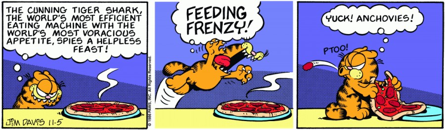 Garfield: The cunning tiger shark, the world's most efficient eating machine with the world's most voracious appetite, spies a helpless feast! Feeding frenzy! Yuck! Anchovies!