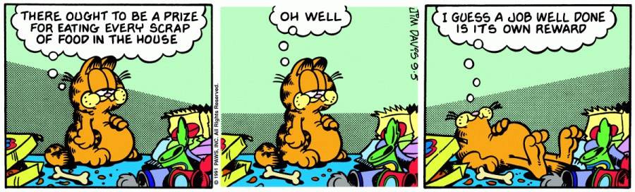 Garfield: There ought to be a prize for eating every scrap of food in the house. Oh well. I guess a job well done is its own reward.