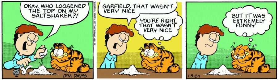 Jon: Okay, who loosened the top on my saltshaker?! Garfield, that wasn't very nice.