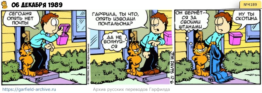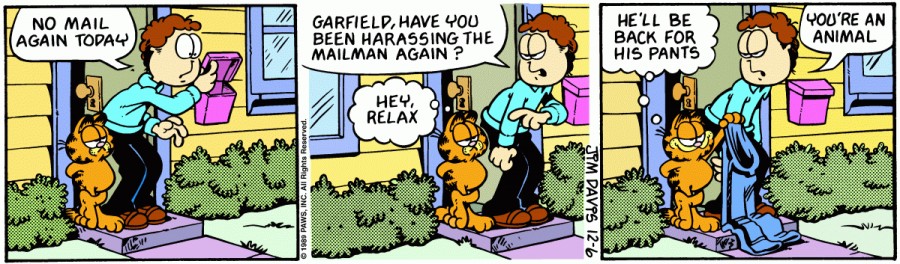 Jon: No mail again today. Garfield, have you been harassing the mailman again?