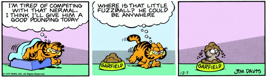 Garfield: I'm tired of competing with that Nermal. I think I'll give him a good pounding today. Where is that little fuzzball? He could be anywhere.