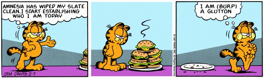 Garfield: Amnesia has wiped my slate clean. I start establishing who I am today. I am (burp) a glutton.