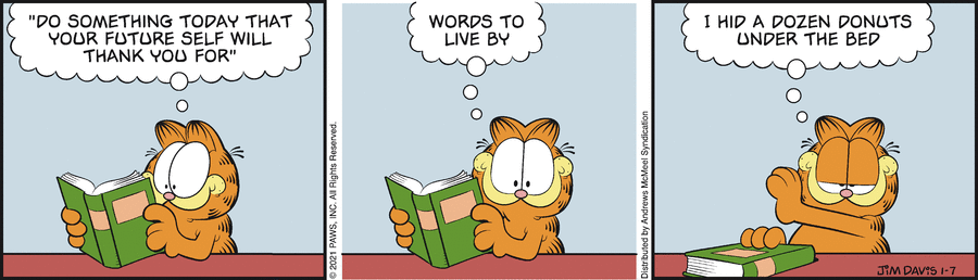 Garfield: «Do something today that your future self will thank you for». Words to live by. I hid a doven donuts under the bed
