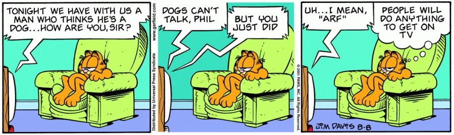 tonight we have with us a man who thinks he's a dog...how are you, sir?