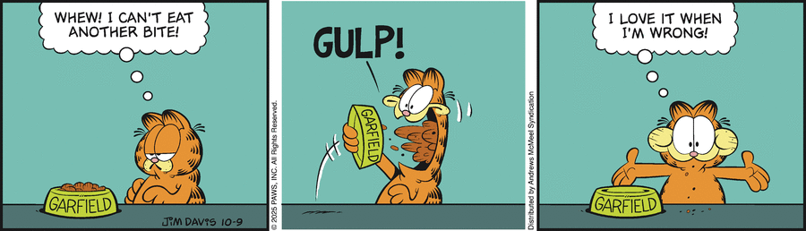 Гарфилд: Фух! В меня больше не влезет. ГЛОТЬ! Гарфилд: Обожаю когда я неправ!