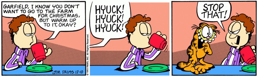Jon: Garfield, I know you don't want to go to the farm for Christmas, but warm up to it, okay?