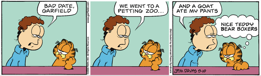 Jon: Bad date, Garfield. We went to a petting zoo... And a goat ate my pants.
