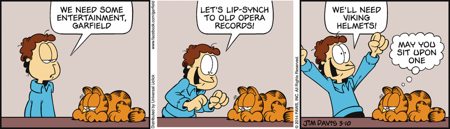 Jon: We need some entertainment, Garfield. Jon: Let's lip-synch to old opera records! Jon: We'll need Viking helmets! Garfield: May you sit upon me.