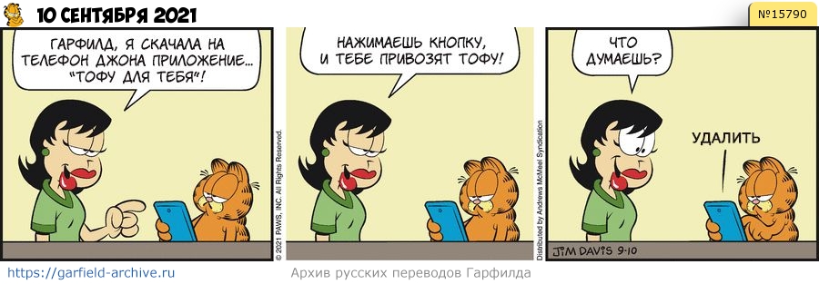 Лиз: Гарфилд, я скачала на телефон Джона приложение... «Тофу для тебя»! Нажимаешь кнопку, и тебе привозят тофу! Что думаешь?