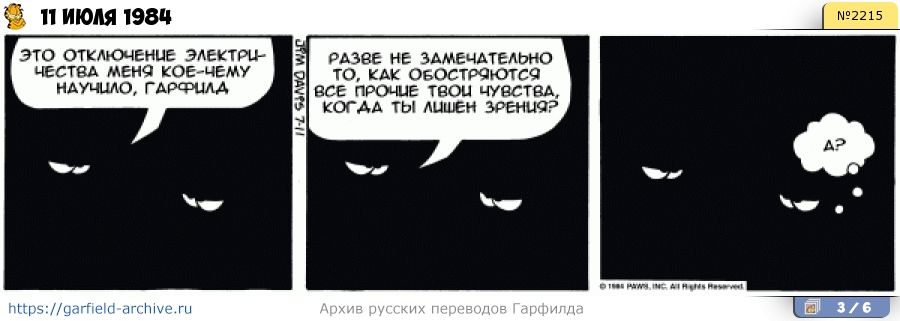 Jon: I've learned something from this power failure, Garfield. When you are deprived of your eyesight, isn't it amazing how much keener our other senses become?