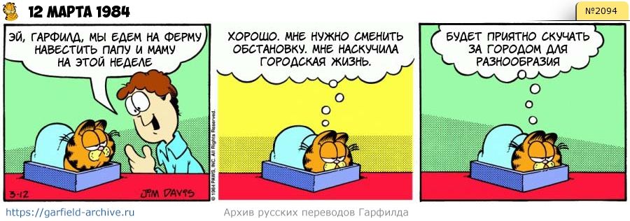 Гарфилд: Хорошо. Мне нужно сменить обстановку. Мне наскучила городская жизнь. Будет приятно скучать за городом для разнообразия