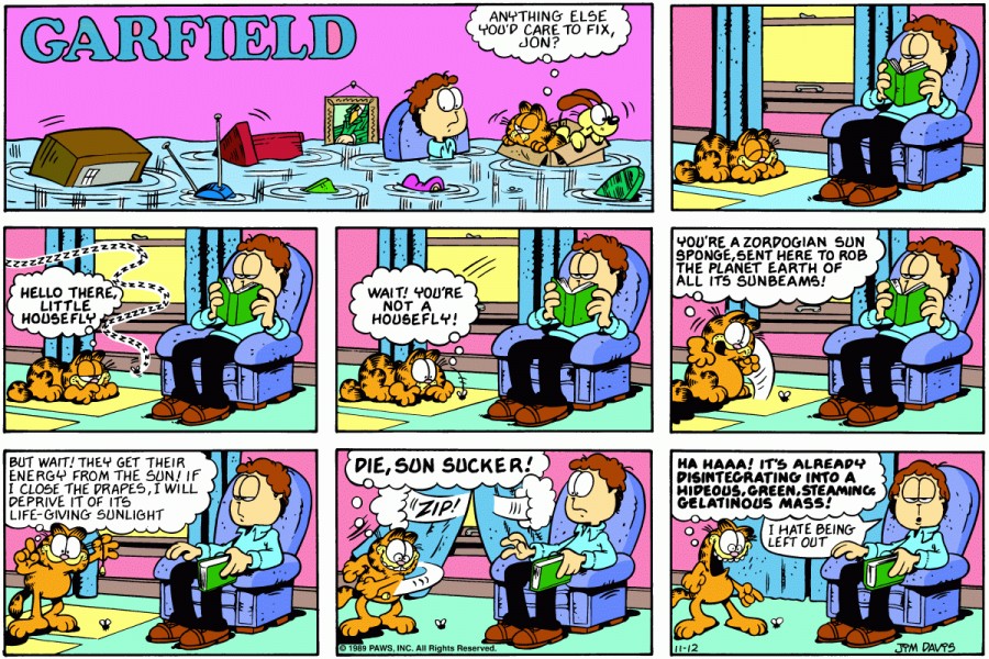 Garfield: Hello there, little housefly. Wait! You're not a housefly! You're a zordogian sun sponge, ,sent here to rob the planet Earth of all its sunbeams! But wait! They get their energy from the sun! If I close the drapes, I will deprive it of its life-giving sunlight. DIE, SUN SUCKER!