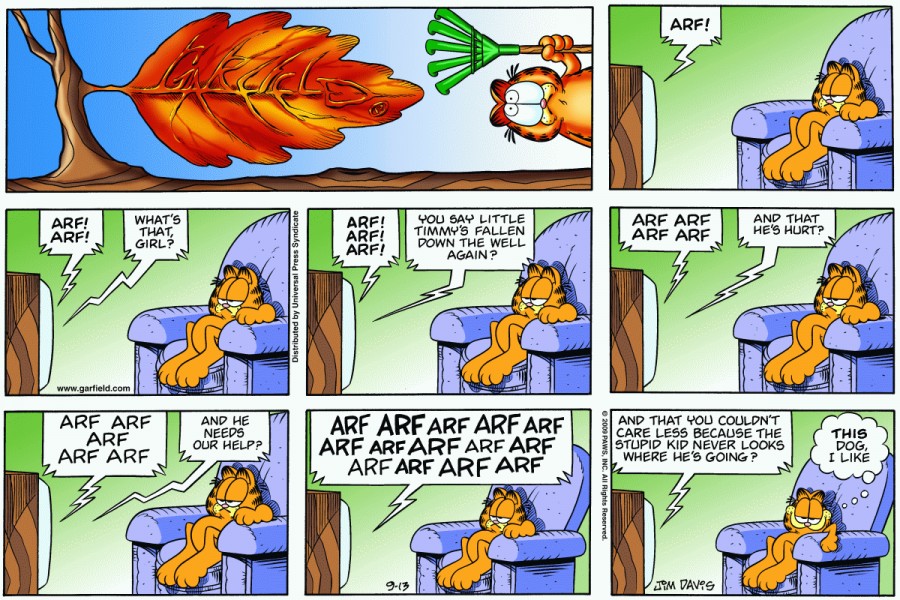 TV: Arf! Arf! Arf! What's that, girl? Arf! Arf! Arf! You say little Timmy's fallen down the well again? ARF ARF ARF ARF. And that he's hurt? ARF ARF ARF ARF ARF. And he needs our help? ARF ARF ARF ARF ARF ARF ARF ARF ARF ARF ARF ARF ARF. And that you couldn't care less because the stupid kid never looks where's he's going?