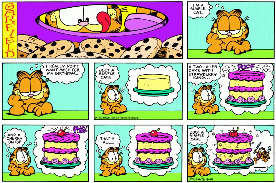 Garfield: I'm a simple cat... I really don't want much for my birthday... Just a simple cake. A two layer cake with strawberry icing... And a cherry on top. That's all... Just a simple cake.