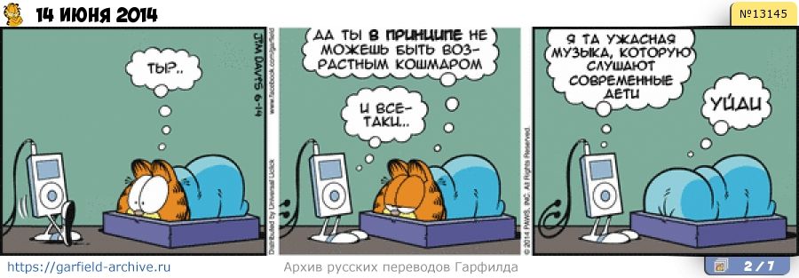 Garfield: You? Ipod: Oh, but I am... Garfield: You can't possibly be an age nightmare. Ipod: I'm that awful music that kids today listen to! Garfield: Go away!