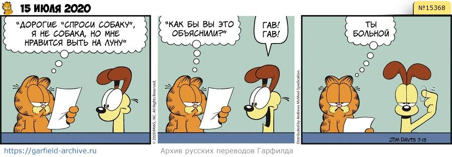 Гарфилд: «Дорогие «Спроси собаку», я не собака, но мне нравится выть на Луну. Как бы вы это объяснили?»