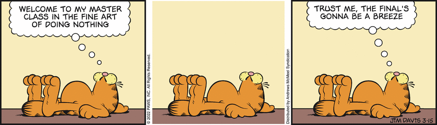 Garfield: Welcome to my master class in the fine art of doing nothing. Trust me, the final's gonna be a breeze
