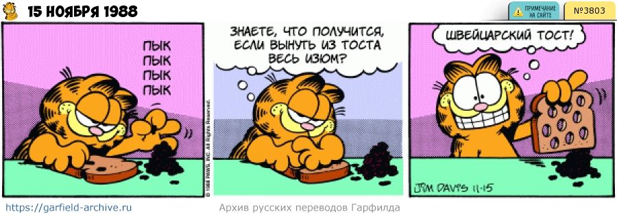 Garfield: Do you know what you get when you pick the raisins off your toast? Swiss toast!