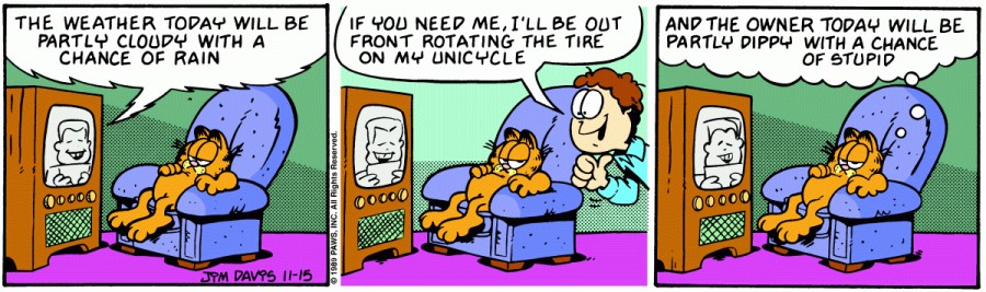 Garfield: And the owner today will be partly dippy with a chance of stupid.