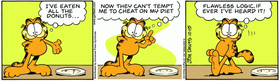 Garfield: I've eaten all the donuts... Now they can't tempt me to cheat on my diet. Flawless logic, if ever I've heard it!