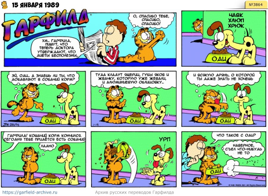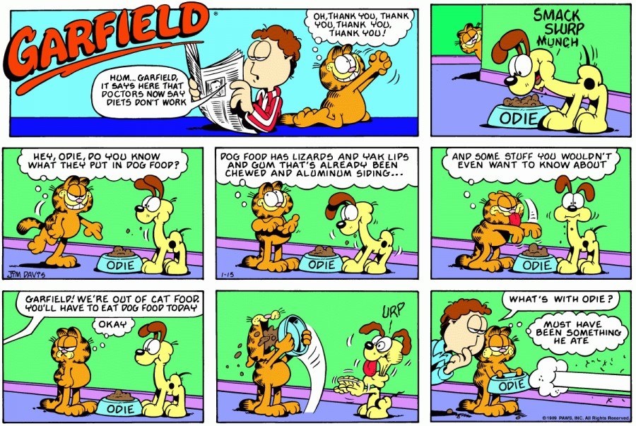 Jon: Garfield! We're out of cat food. You'll have to eat dog food today.