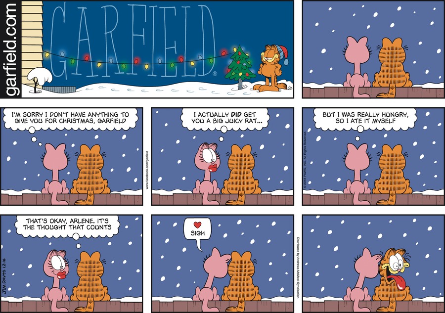 Arlene: I'm sorry I don't have anything to give you for Christmas, Garfield. I actually DID get you a big juicy rat... But I was really hungry, so I ate it myself
