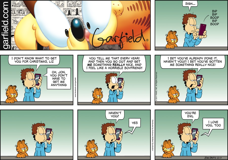 Jon: You tell me that every year! And then you go out and get ME something REALLY nice, and I feel like a horrible boyfriend! I bet you've already done it, haven't you?! I bet you've gotten me something really nice! Haven't you?