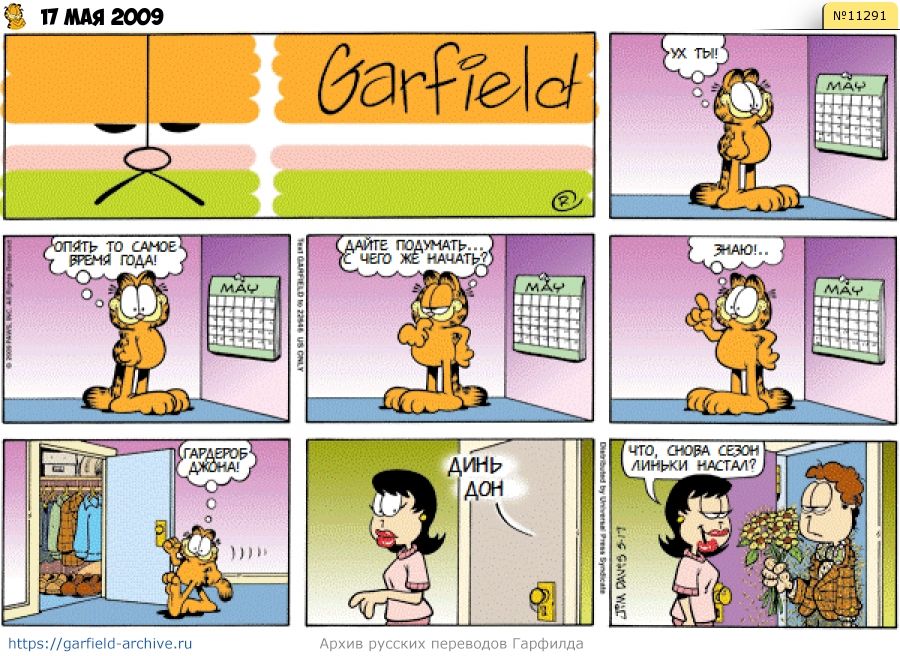 Garfield: Oh, boy! It's that time of year again! Let's see...where shall I begin? I know!... Jon's closet!