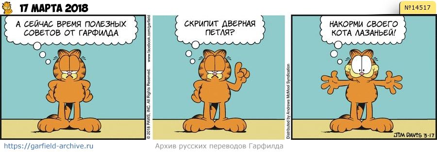 Гарфилд: А сейчас время полезных советов от Гарфилда. Скрипит дверная петля? Накорми своего кота лазаньей!