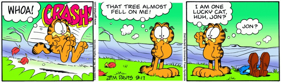 Garfield: That tree almost fell on me! I am one lucky cat, huh, Jon? Jon?