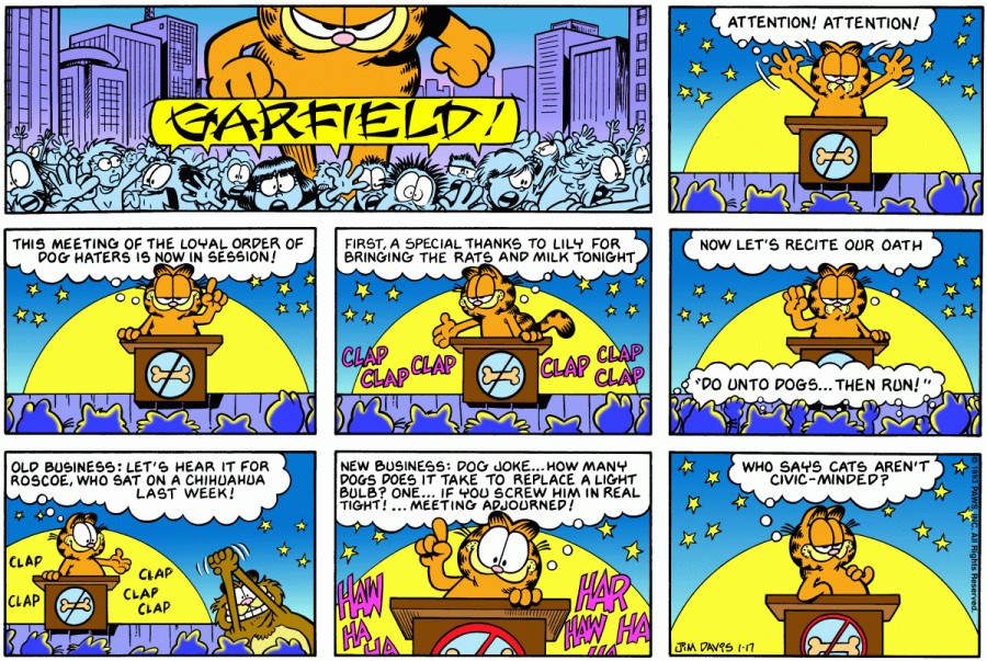 Garfield: New business: Dog joke...how many dogs does it take to replace a light bulb? One...if you screw him in real tight!...Meeting adjourned! Who says cats aren't civic-minded?
