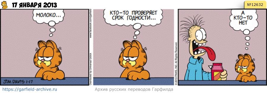 Гарфилд: Молоко... Гарфилд: Некоторые смотрят на срок годности Гарфилд: А некоторые - нет