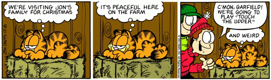 Garfield: We're visiting Jon's family for Christmas. It's peaceful here on the farm.