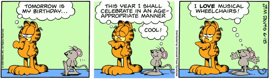 Garfield: Tomorrow is my birthday... This year I shall celebrate in an age-appropriate manner.